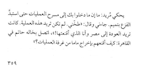عندما عادت لتتكلم في الفصول التالية عن رحلتها الثانية للعلاج ، تذكرت أمي رحمة الله عليها ، وربطت بين إصرار تميم وندمه على إجراء والدته للجراحة رغم عدم رغبتها في ذلك بإصراري وندمي أنا أيضًا على إجراء غسيل الكلى لأمي والتي رضخت لإصراري رغم عدم رغبتها في ذلك ، لقد أبلغتني أن جسدها الواهن لن يتحمل غسيل الكلى ، وأنها سوف تموت أثناء عملية الغسيل ، ولقد ماتت فعلاً في بداية العملية!